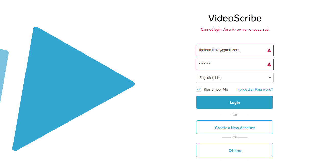 Sau khi tạo tài khoản như hướng dẫn, khi đăng nhập vào videoscribe xuất hiện lỗi “Cannot login: An unknown error occurred”, nên em không đăng nhập vào được ạ. Hướng dẫn giúp em cách sửa lỗi với ạ
