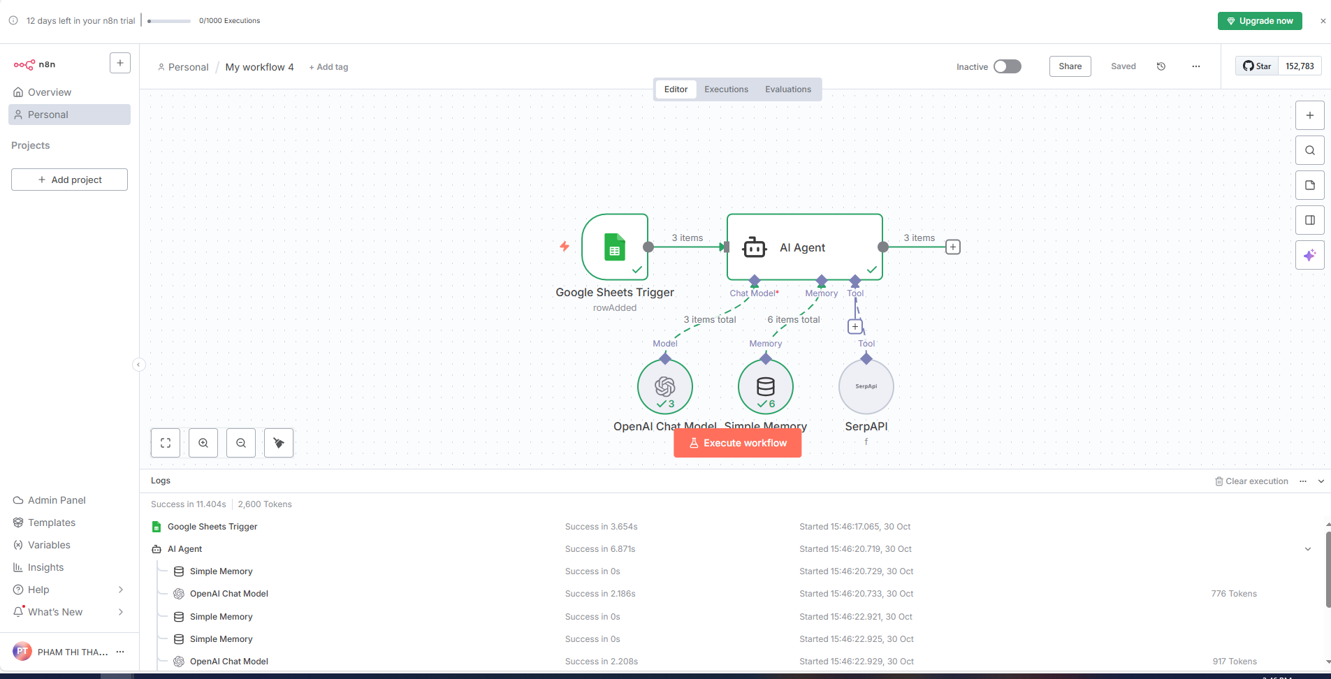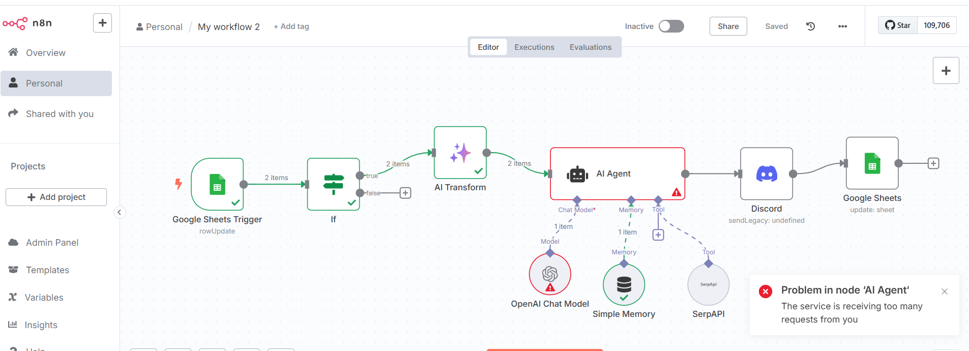 Bạn đang gửi 2 items từ Google Sheets Trigger → AI Agent cùng lúc, khiến hệ thống gửi 2 yêu cầu đồng thời đến OpenAI. Điều này rất dễ vượt giới hạn.