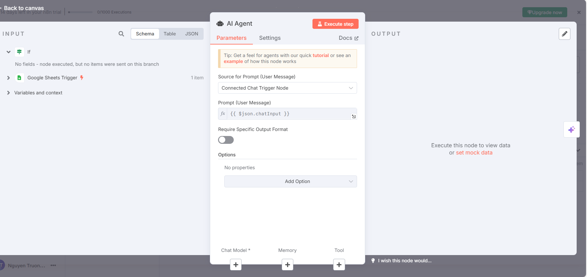 Hiện tại bản cập nhật mới nhất của n8n đã bỏ tính năng chọn các loại AI Agent rồi, họ để mặc định là 1 loại AI Agent như bạn đang chụp hình, và nó vẫn là loại AI Agent để tạo hội thoại nên không ảnh hưởng đến bài thực hành bạn nhé, bạn cứ tiếp tục các bước tiếp theo nhé.
