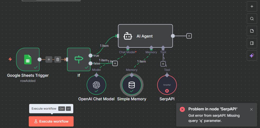 chào bạn, lỗi này là do trong phần cài đặt tham số Parameters của node SerpAPI, có cái trường Query (q) bạn đang để trống hoặc không được map dữ liệu từ node trước đó. Bạn điền thêm thông tin ở trường Query (q) hoặc kéo dữ liệu từ node trước vào ô đó là fix được lỗi này.