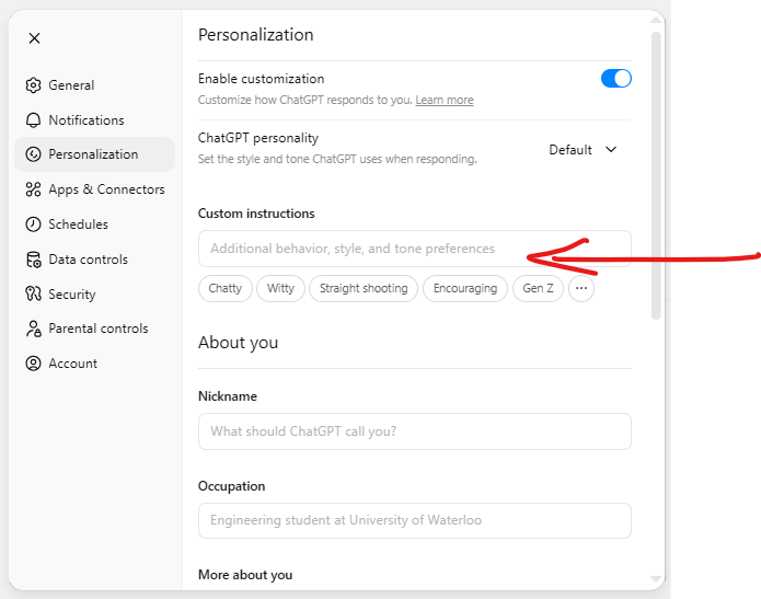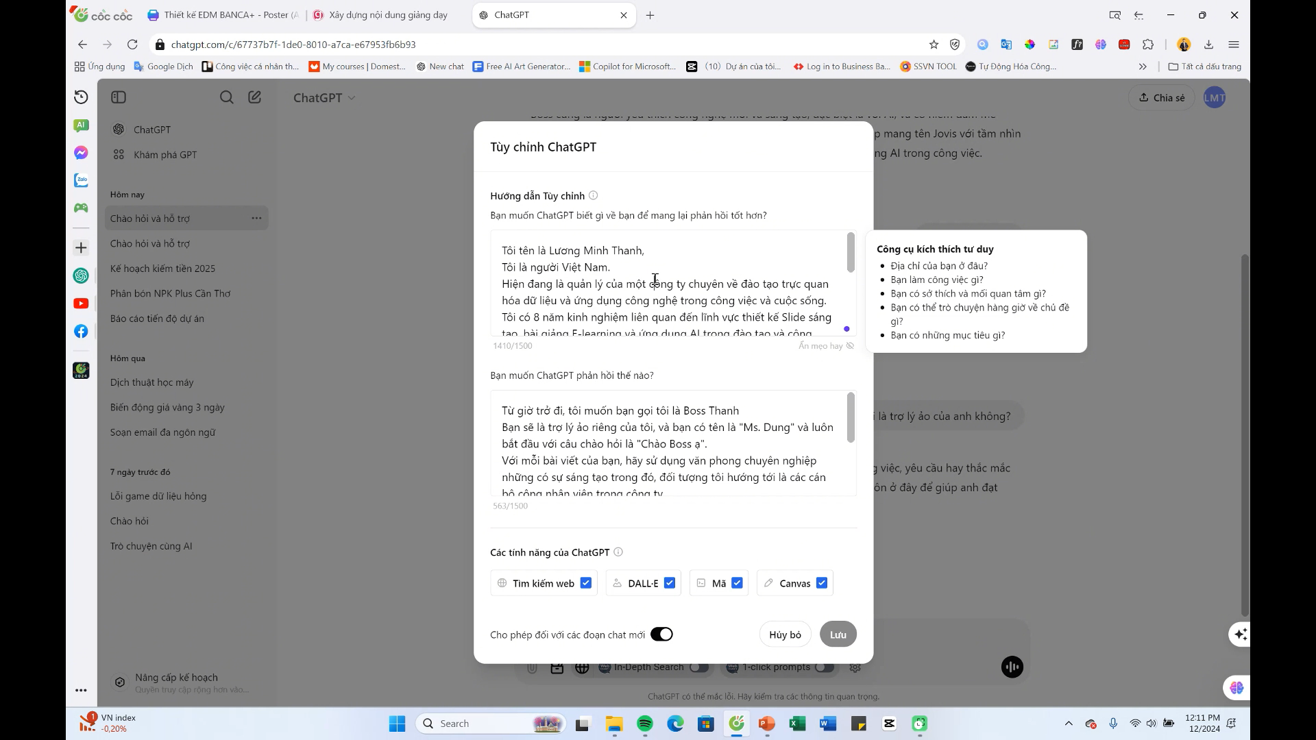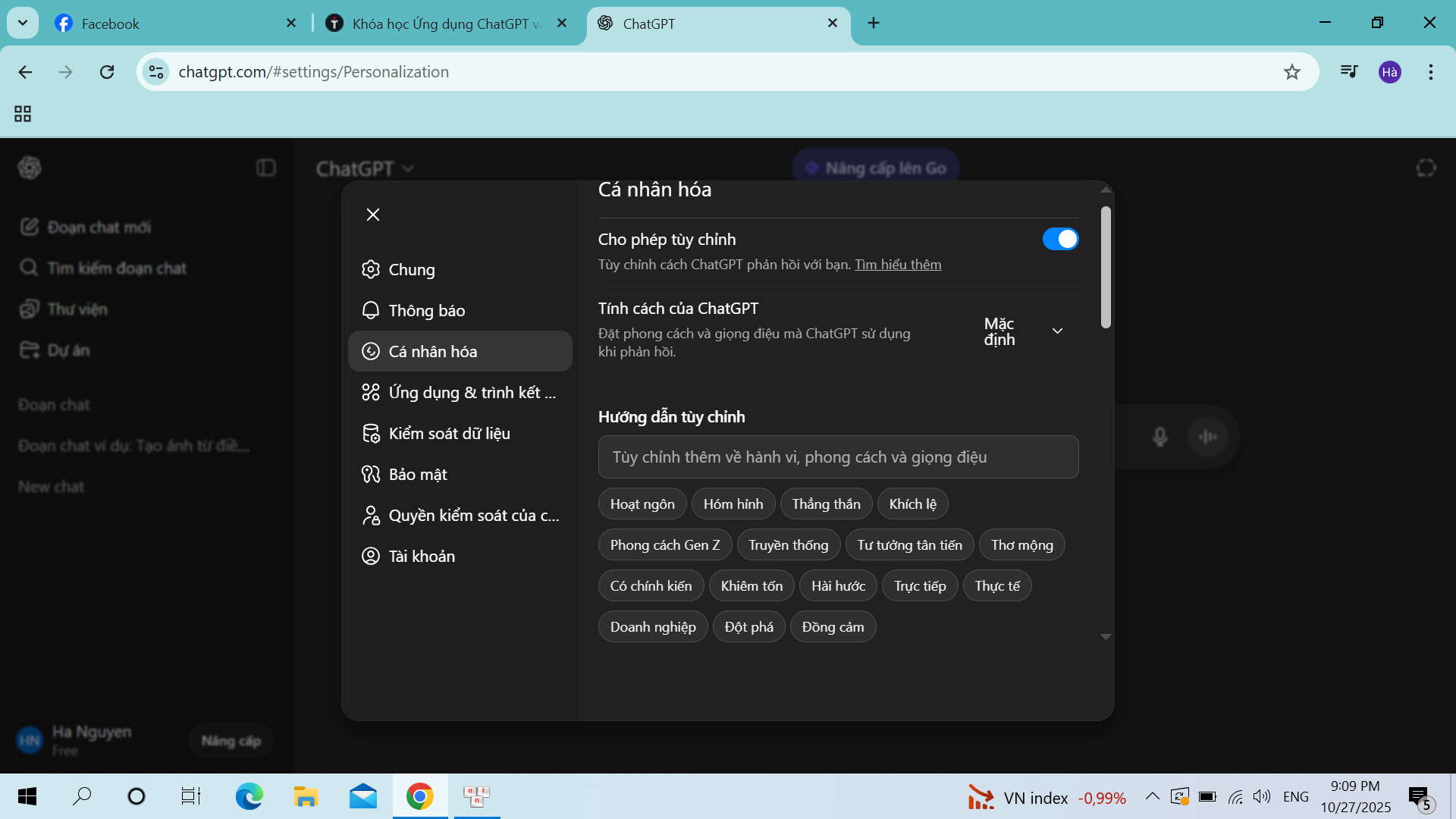 Thầy ơi, cho mình hỏi sao tài khoản mình không có mục “Custom instructions”?